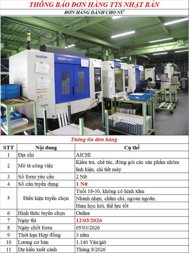 TUYỂN DỤNG ĐƠN HÀNG GIA CÔNG KIM LOẠI – NỮ THÁNG 03/2020